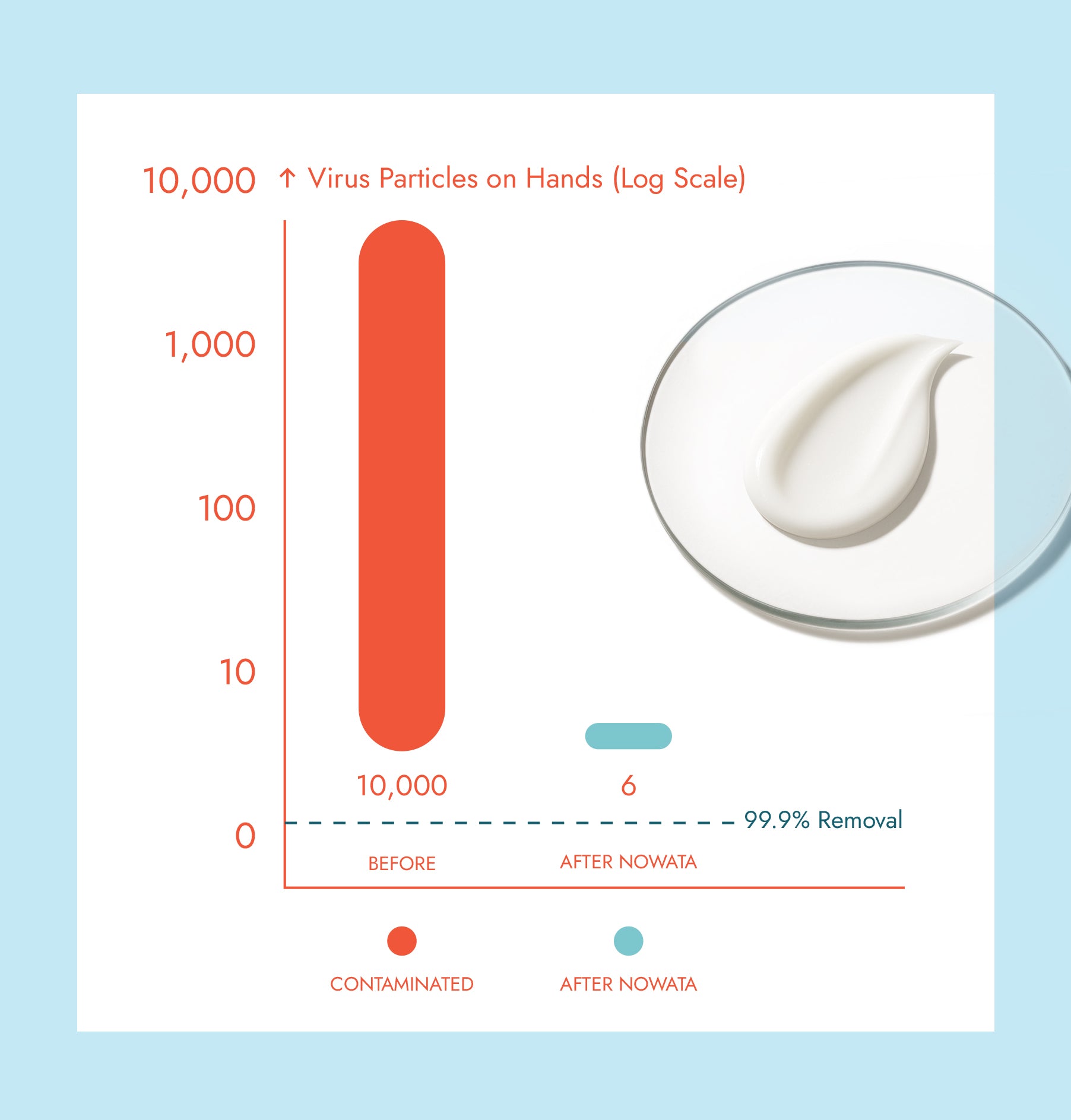 In a Swiss lab study, NOWATA Soap was shown to physically remove ≥ 99.9% of norovirus particles from hands using a simple apply → rub → wipe routine — with no water required.*